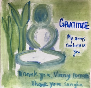 This Coronavirus Diary is a collaboration with artist, writer and Dharma friend Geraldine DeLuca, who lives in Vermont, USA. We met while in a small group together on a Dharma and Art course at Barre Center for Buddhist Studies, USA. A friendship via Zoom ensued. With both of us wondering how to process the coronavirus pandemic, I mooted the idea of our doing parallel visual and written coronavirus diaries, emailing entries to each other daily. The aim would be to express and document the evolving process of learning to integrate Dharma and art practices with our experience of the pandemic, and maybe bring some understanding, clarity and even healing for ourselves and others.